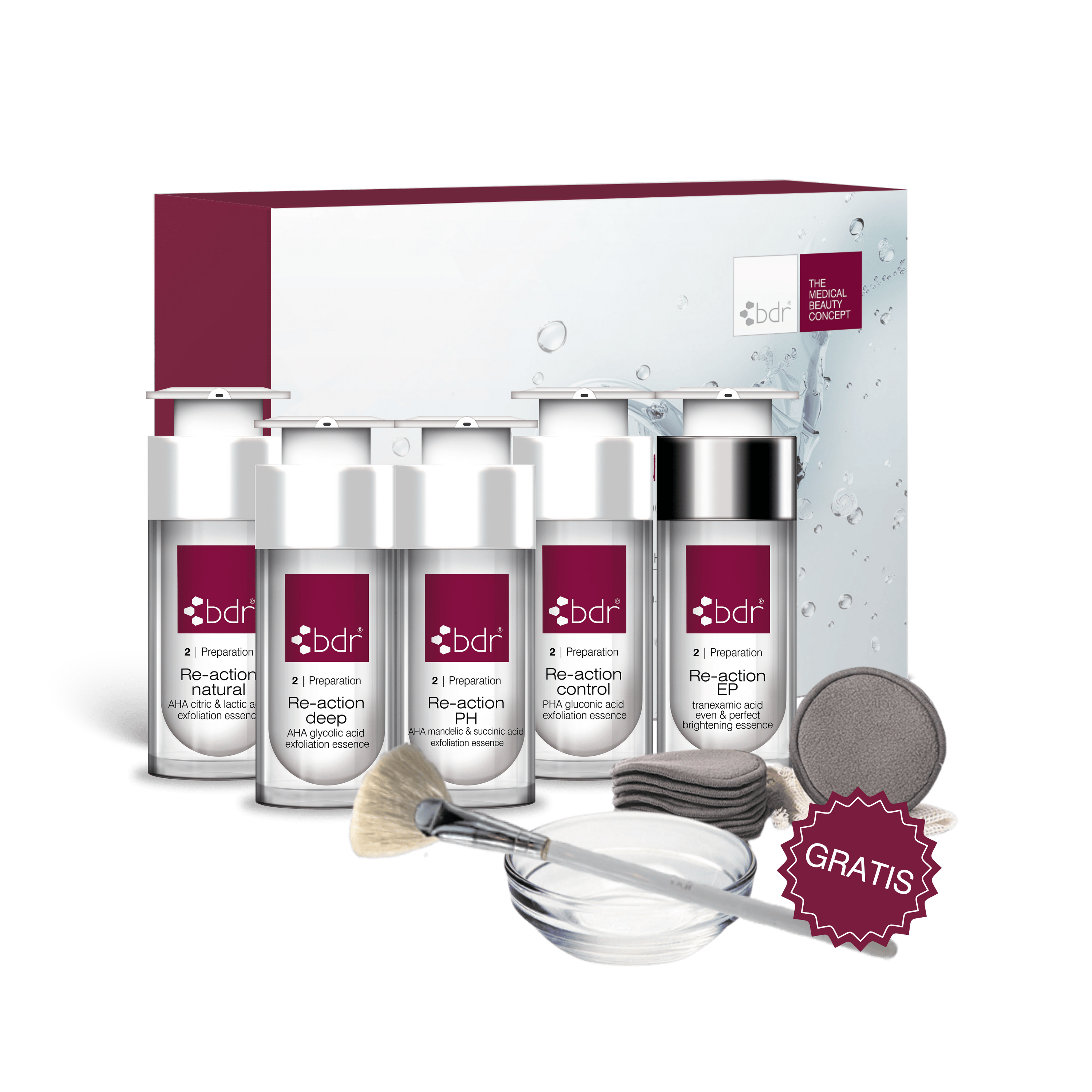 Wähle deine bdr® Säure passend zu deinem Hautbedürfnis und erhalte professionelle Kosmetiktools gratis. (Pinsel, Schälchen und 2 Baumwollpads)