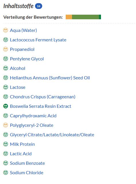 Aqua (Water), Lactococcus Ferment Lysate, Propanediol, Pentylene Glycol, Alcohol, Helianthus Annuus (Sunflower) Seed Oil, Lactose, Chondrus Crispus (Carrageenan), Boswelia Serrata (Boswelia Serata Extract), Caprylhydroxamic Acid, Polyglyceryl-2 Oleate, Glyceryl Citrate/Lactate/Linoleate/Oleate, Milk Protein, Lactic Acid, Sodium Benzoate, Sodium Chloride