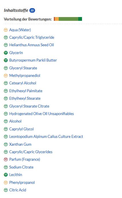 Die weiteren enthaltenen Lipide wie das hochwertige und besonders verträgliche Neutralöl (Caprylic / Capric Triglyceride) sowie Oliven- und Sonnenblumenöl kleben nicht auf der Haut, sondern pflegen intensiv und hinterlassen nichts als ein seidenweiches Hautgefühl!