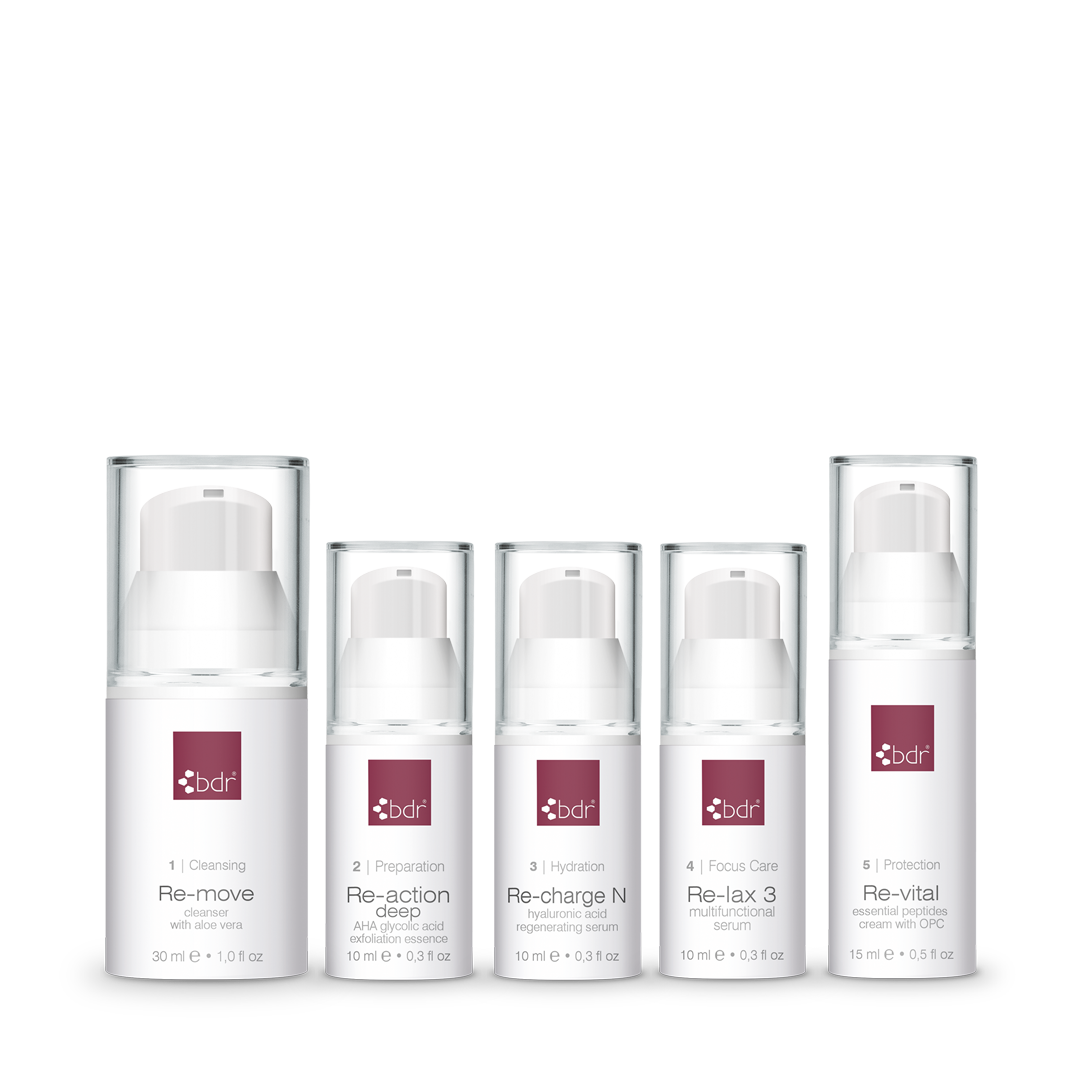 Inhalt Re-move 30ml, Re-action deep 10ml, Re-chargeN 10ml, Re-lax 3 10ml & Re-vital 15ml