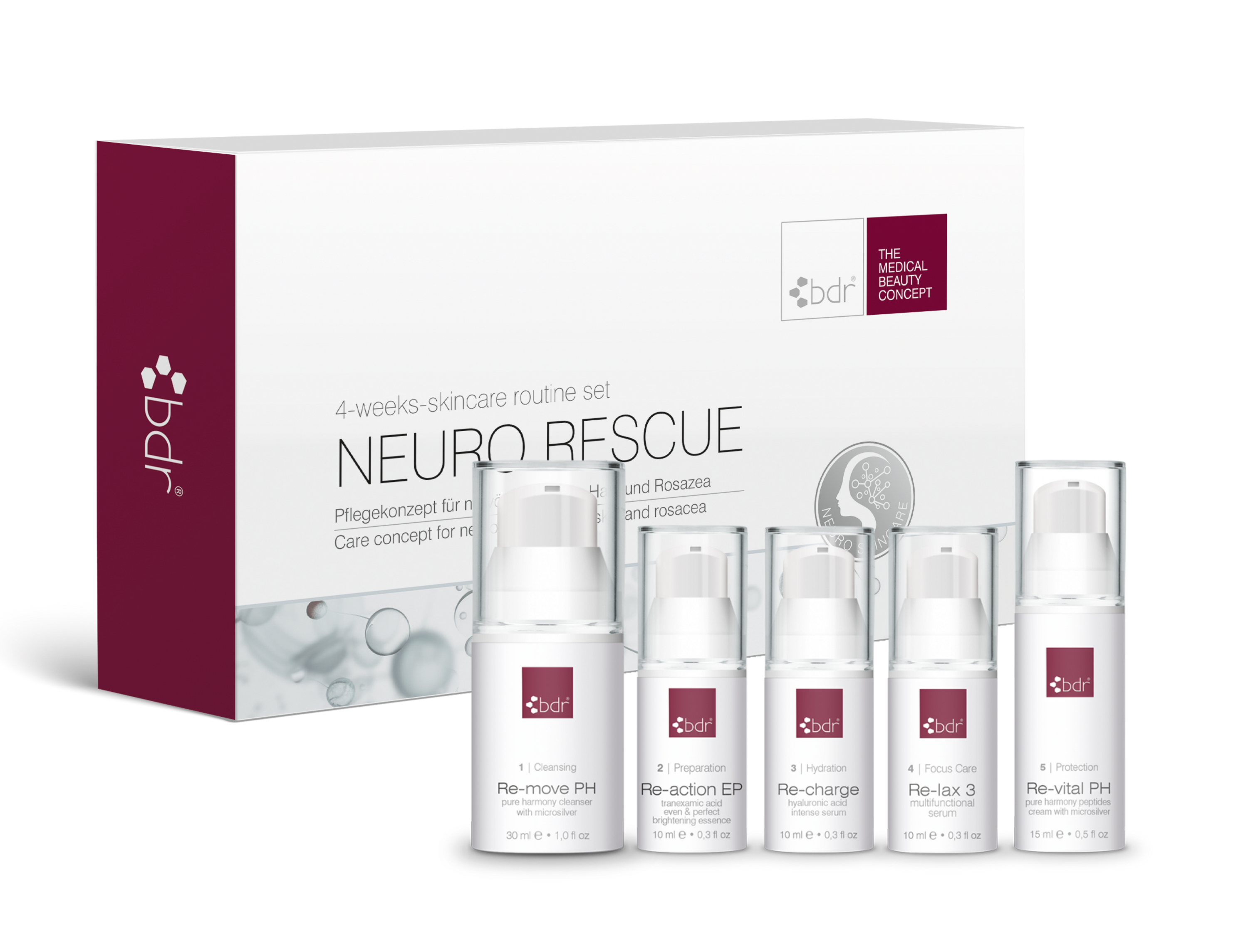 Beginnen Sie Ihr Neuro Rescue Pflegeritual mit unserer talgregulierenden Reinigungsmilch Re-move PH, die mit mikronisiertem Silber und Seboclear® angereichert ist und Unreinheiten sanft klärt. Bekämpfen Sie Pigmentflecken mit unserem Re-action EP Fluid, das mit Tranexamsäure und Niacinamid die Haut aufhellt und eine ebenmäßige Ausstrahlung fördert. Erleben Sie die intensive Hydration mit unserem Re-charge Hyaluronserum, das die Haut durchfeuchtet und sichtbar aufpolstert. Vollenden Sie Ihr Pflegeritual mit unserem beruhigenden Re-vital PH Fluid, das entzündliche Prozesse mindert und die Haut beruhigt für ein harmonisches Hautbild.