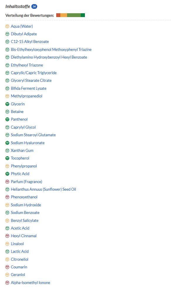 INCI: AQUA (WATER), DIBUTYL ADIPATE, C12-15 ALKYL BENZOATE, BIS-ETHYLHEXYLOXYPHENOL METHOXYPHENYL TRIAZINE, DIETHYLAMINO HYDROXYBENZOYL HEXYL BENZOATE, ETHYLHEXYL TRIAZONE, CAPRYLIC/CAPRIC TRIGLYCERIDE, GLYCERYL STEARATE CITRATE, BIFIDA FERMENT LYSATE, METHYLPROPANEDIOL, GLYCERIN, BETAINE, PANTHENOL, CAPRYLYL GLYCOL, SODIUM STEAROYL GLUTAMATE, SODIUM HYALURONATE, XANTHAN GUM, TOCOPHEROL, PHENYLPROPANOL, PHYTIC ACID, PARFUM (FRAGRANCE), HELIANTHUS ANNUUS (SUNFLOWER) SEED OIL, PHENOXYETHANOL, SODIUM HYDROXIDE, SODIUM BENZOATE, BENZYL SALICYLATE, ACETIC ACID, HEXYL CINNAMAL, LINALOOL, LACTIC ACID, CITRONELLOL, COUMARIN, GERANIOL, ALPHA-ISOMETHYL IONONE.