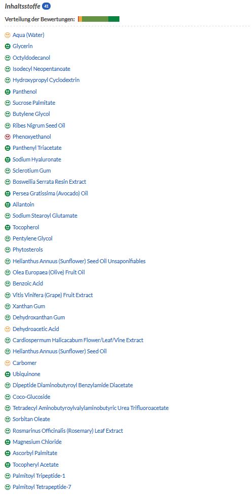 AQUA (WATER), GLYCERIN, OCTYLDODECANOL, ISODECYL NEOPENTANOATE, HYDROXYPROPYL CYCLODEXTRIN, PANTHENOL, SUCROSE PALMITATE, BUTYLENE GLYCOL, RIBES NIGRUM SEED OIL, PHENOXYETHANOL, PANTHENYL TRIACETATE, SODIUM HYALURONATE, SCLEROTIUM GUM, PERSEA GRATISSIMA (AVOCADO) OIL, ALLANTOIN, SODIUM STEAROYL GLUTAMATE, TOCOPHEROL, BOSWELLIA SERRATA RESIN EXTRACT, PENTYLENE GLYCOL, PHYTOSTEROLS (Beta-Sitosterol, Camperosterol, Stigmasterol, Braccicasterol), HELIANTHUS ANNUUS (SUNFLOWER) SEED OIL UNSAPONIFIABLES, OLEA EUROPAEA (OLIVE) FRUIT OIL, BENZOIC ACID, VITIS VINIFERA (GRAPE) FRUIT EXTRACT, XANTHAN GUM, DEHYDROXANTHAN GUM, DEHYDROACETIC ACID, CARDIOSPERMUM HALICACABUM FLOWER/LEAF/VINE EXTRACT, HELIANTHUS ANNUUS (SUNFLOWER) SEED OIL, CARBOMER, UBIQUINONE (Q10), DIPEPTIDE DIAMINOBUTYROYL BENZYLAMIDE DIACETATE, COCO-GLUCOSIDE, TETRADECYL AMINOBUTYROYLVALYLAMINOBUTYRIC UREA TRIFLUOROACETATE, SORBITAN OLEATE, ROSMARINUS OFFICINALIS (ROSEMARY) LEAF EXTRACT, MAGNESIUM CHLORIDE, ASCORBYL PALMITATE, TOCOPHERYL ACETATE, PALMITOYL TRIPEPTIDE-1, PALMITOYL TETRAPEPTIDE-7.