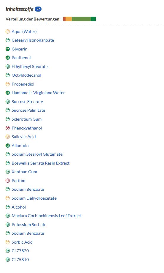 Reinigt sanft und beruhigt meine gestresste Haut. Ich habe deutlich weniger Entzündungen und meine Haut fühlt sich super an. Sehr empfehlenswert!